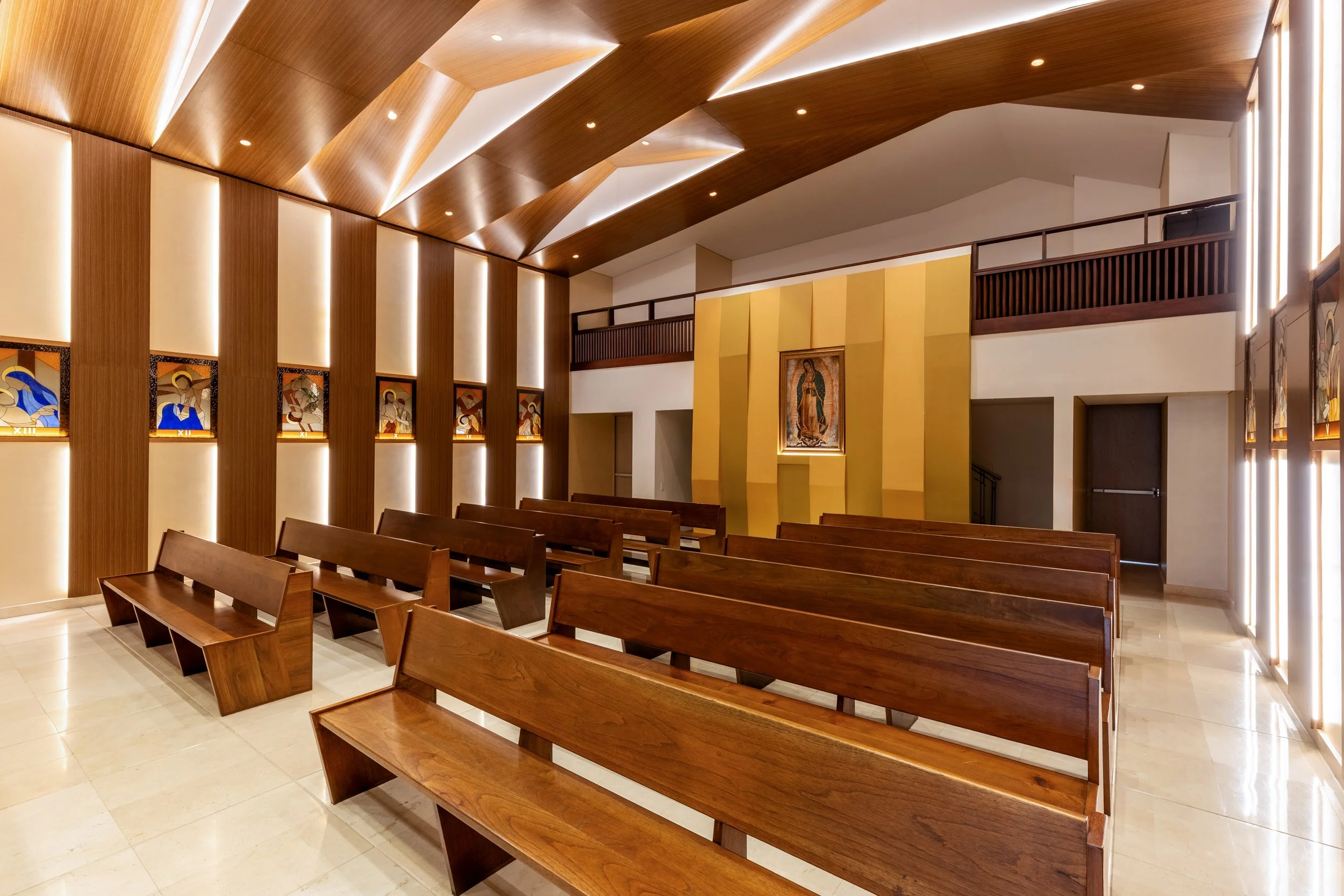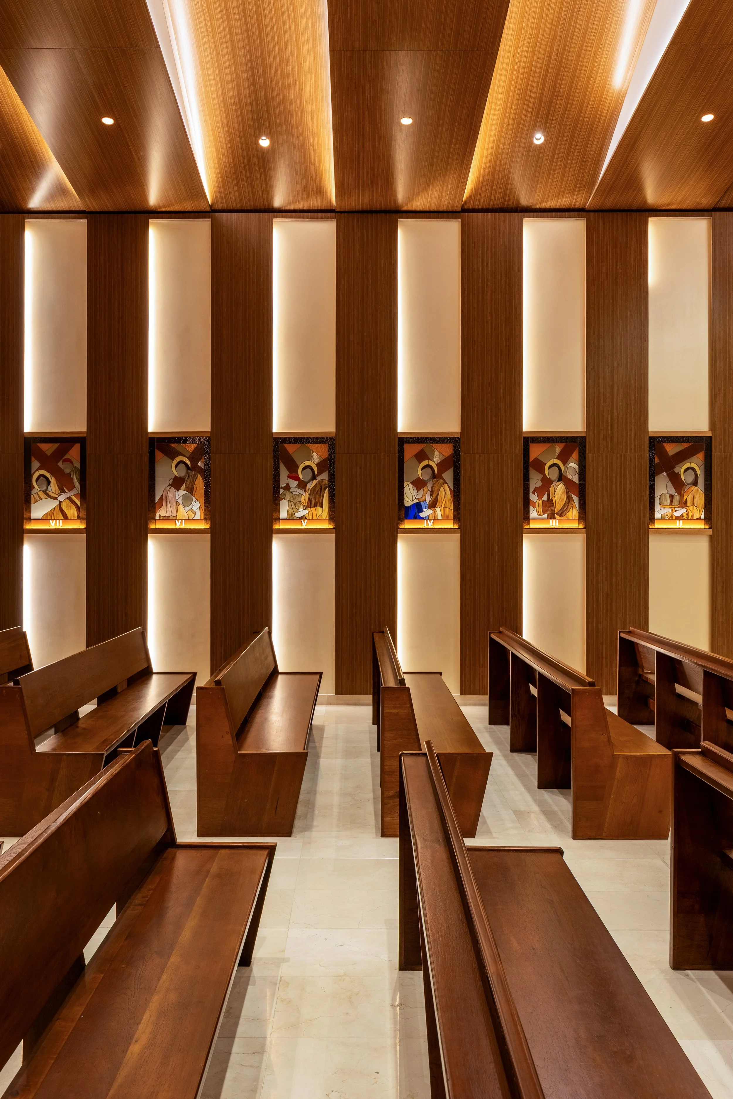 The chapel feels intimate for quiet reflection, yet open enough to accommodate a full congregation, offering a peaceful, flexible space for both solitude and community
